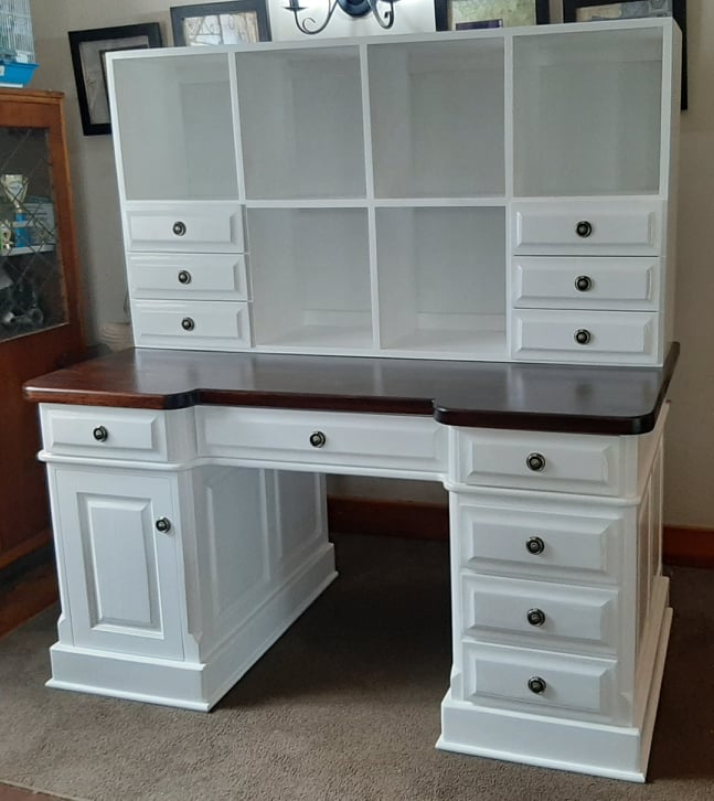Craft room desk and storage solution. Cubbyholes and many drawers in solid wood painted white and saligna top